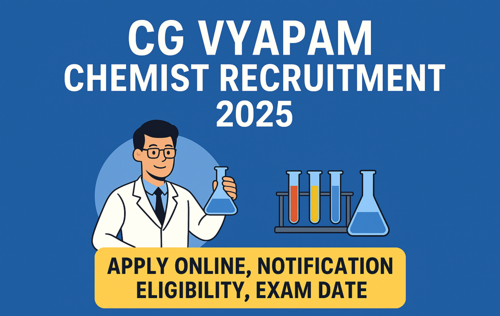 CG Vyapam Chemist Recruitment 2025:- छत्तीसगढ़ व्यावसायिक परीक्षा मंडल (CG Vyapam) ने हाल ही में CG Vyapam Chemist Recruitment 2025 के लिए official notification जारी किया है। यह भर्ती उन candidates के लिए golden opportunity है, जिनके पास Chemistry field में background है और वे सरकारी नौकरी की तलाश कर रहे हैं।